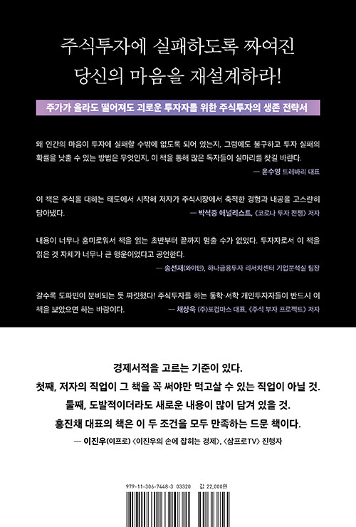 일체유심조(一切唯心造), 모든 것은 마음먹기에 달려 있다는 불교의 가르침을 떠올려 본다. 차라리 주식하지 않는 마음으로 주식을 한다면 어떨까. 가장 쉬운 방법은 휴대폰에서 증권 앱을 지우는 일이다. 쉽지 않은 일이다. 그렇다면 이 책의 도움을 받아 보자. 인기 있는 펀드매니저인 저자가 이 책을 펴낸 까닭은 투자자들이 온갖 감언이설에 현혹되지 않기를, 돈을 잃고 좌절하지 않기를, 그리고 결과적으로 투자의 방향성을 고민하고 수정하기를 바라는 마음에서일 것이다. 책에 담긴 수많은 '증거'들에도 불구하고 지금 단타로 혹은 자신만의 묘수로 재미를 보고 있다면 말릴 생각은 없다. 투자에 아니 인생에 정답은 없으니까. 부디 모두의 마음만은 평온했으면 좋겠다.