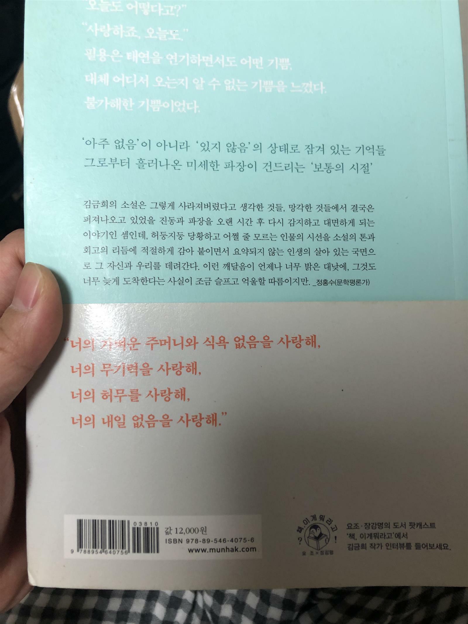 <너무 한낮의 연애>의 펀치라인 "사랑하죠, 오늘도."처럼, 김금희가 만들어낸 세계의 사람들은 심상한 말로 세계의 진실의 한 단면을 정의한다. 식대 구만원을 환급받기 위해서 점심시간이면 점심식사를 하지 않는 걸 증명하기 위해 정수기 옆에 한 시간을 서있어야 했던 조중균씨가 내뱉는 "확인을 원하는 겁니다."라는 말. (조중균의 세계 中) 학대와 공평한 사랑 사이에서 들려오는 "아가씨, 나는 하느님만 섬기며 아주 착하게 살았어. 그런데 결국 이렇게 되었어." (우리가 어느 별에서 中) 같은 말의 울림 같은. 많은 말을 하지 않는 이들이 보여주는 애처로운 모습들은 끝내 이 미숙한 사람들을 좋아하게 만든다. 문학평론가 신형철이 "적어도 지금 내가 가장 읽고 싶은 것은 그의 다음 소설이다."라고 추천한 젊은 소설가의 안정적인 솜씨가 미세한 파장이 되어 '보통의 시절'을 두드린다.