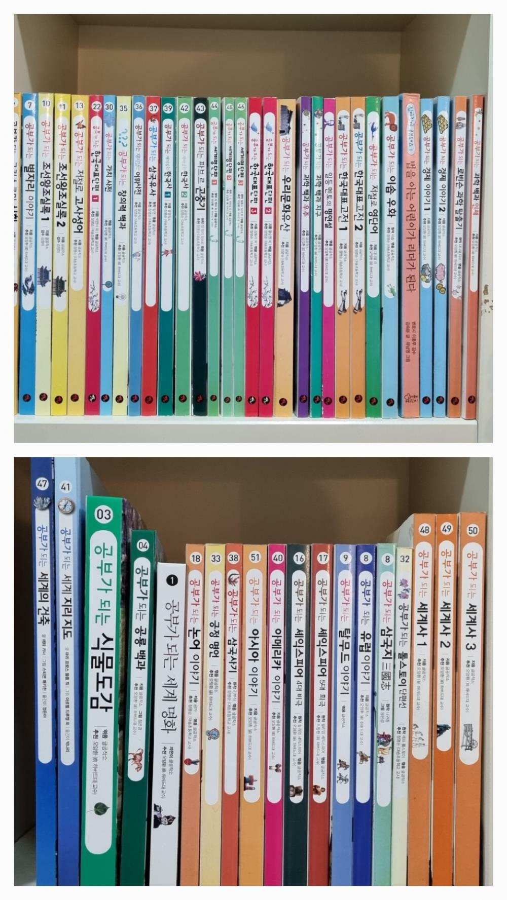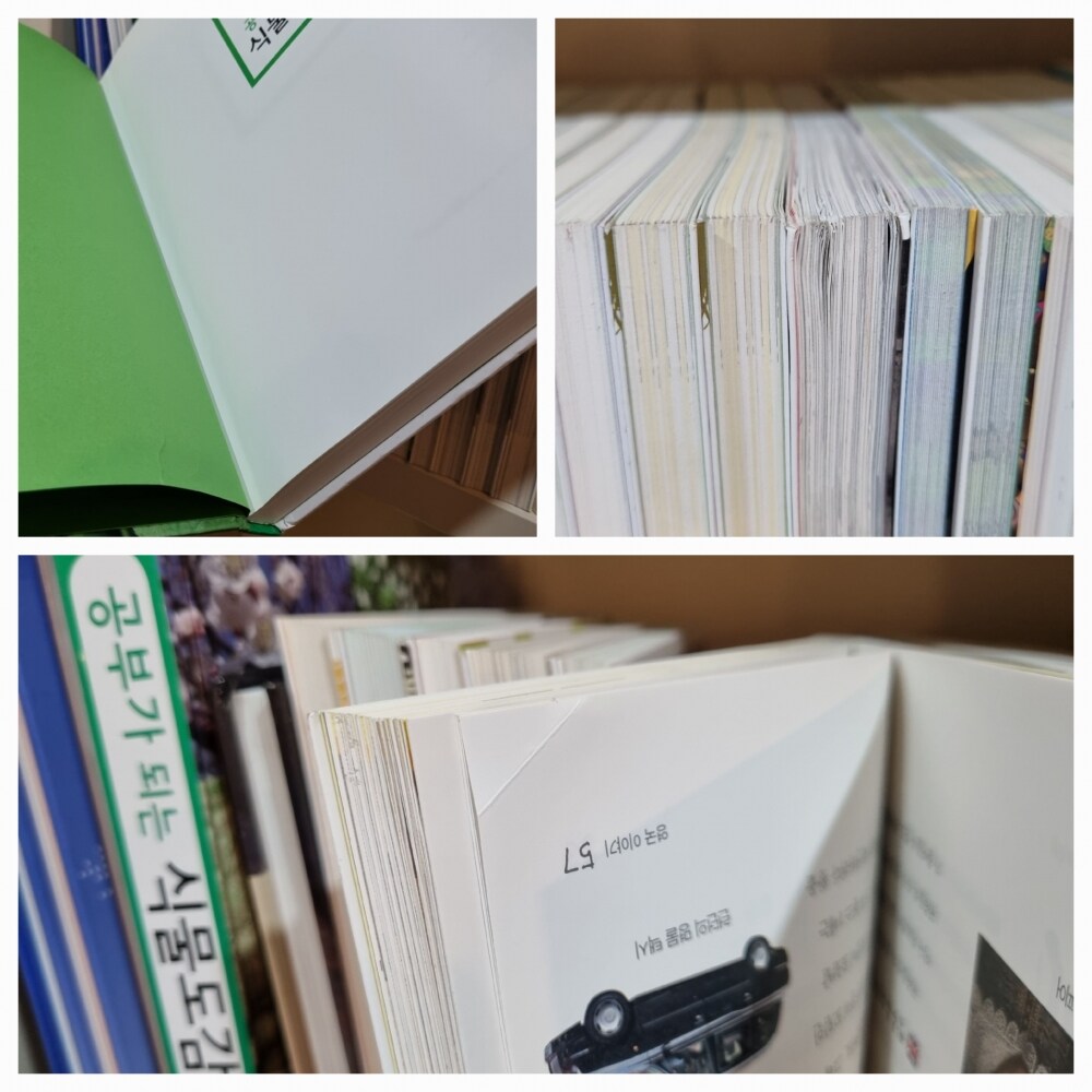 ●검수하면서 식물도감책 앞간지 3cm정도 찢김 있고 한국사 2번책기둥하단 쓸림, 세권정도 모서리 접힘흔 확인했고 정도는 경미하지만 네번째사진에 첨부합니다.