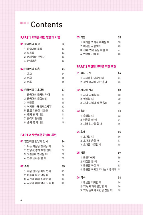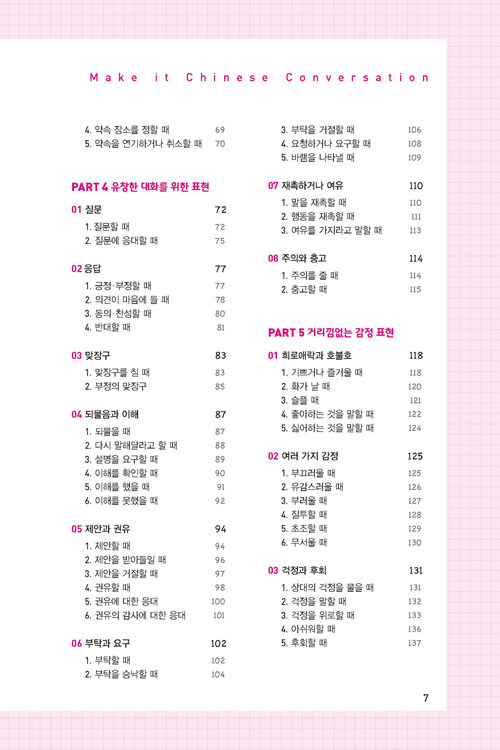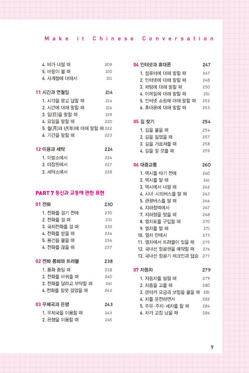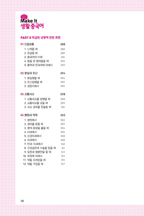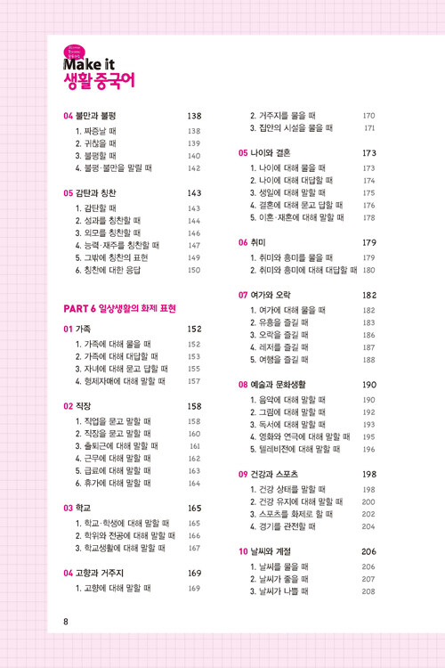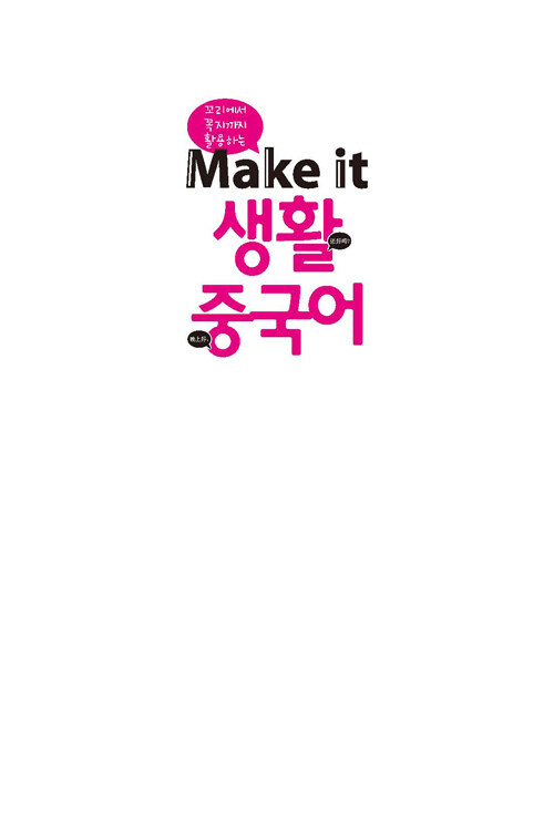 『Make it 생활중국어』는 기초 정도의 중국어 실력을 가지고 회화를 막 시작하려는 학습자를 대상으로 일상생활, 여행 등에 기본적으로 쓰일 수 있는 회화표현을 엄선하였습니다. 어떤 장면이나 상황에서도 중국어 회화를 정확하고 다양하게 익힐 수 있도록 체계적으로 구성했습니다.