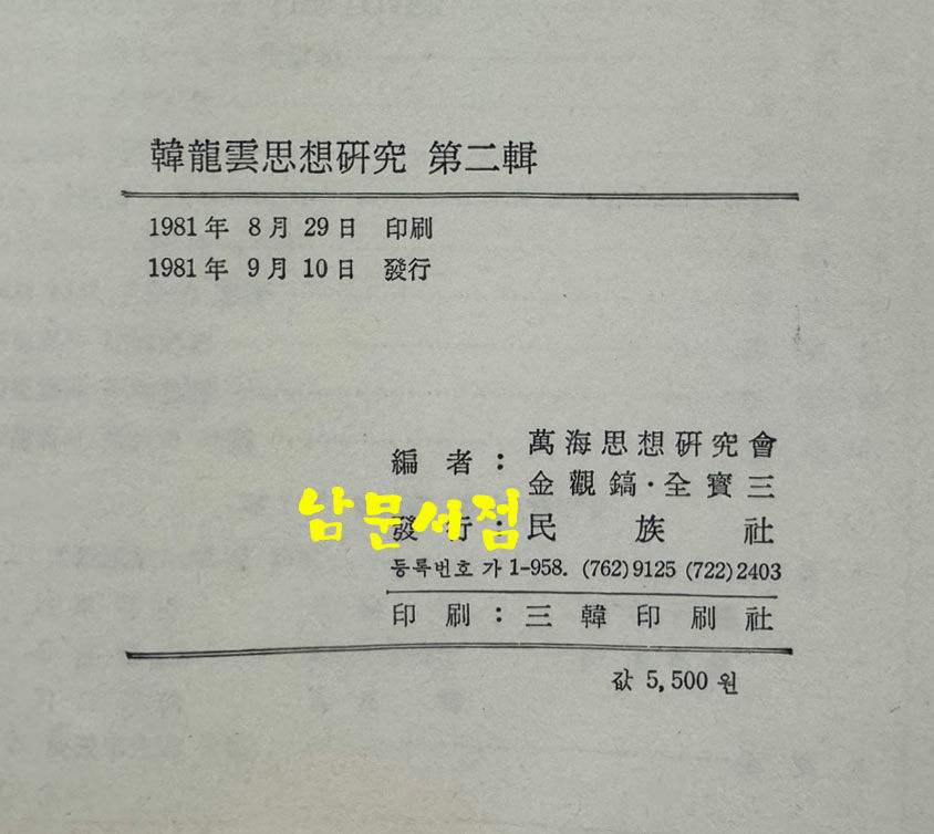 • [중고] 한용운사상연구 제2집 / 만해사상연구회편 / 민족사 / 1981년 초판 / 379페이지 검색