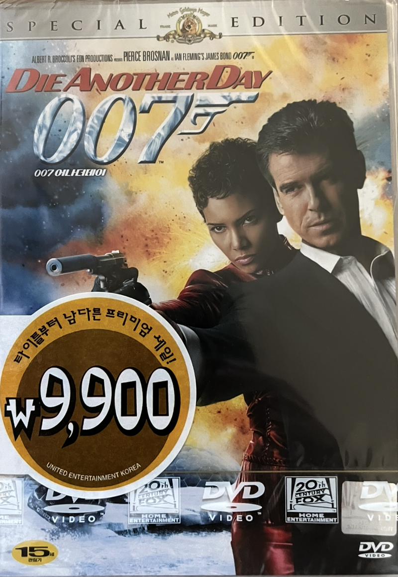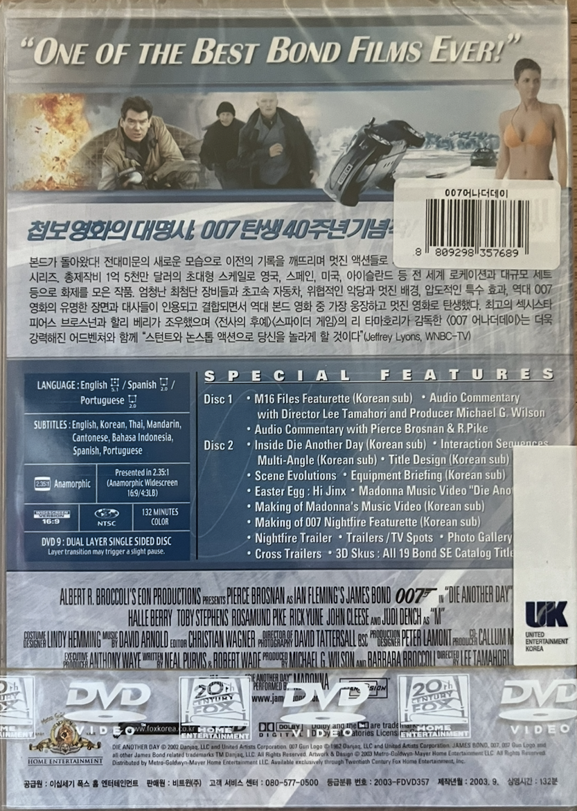 Special Features- Interative Menu(대화형 메뉴)- Scene Selections(장면선택)* Disc 1- M16 Files Featurette : MI6 파일 특작단편 (한글자막 지원)- Audio Commentary with Director Lee Tamahori and Producer Michael G. Wilson리 타마호리 감독과 마이클 G. 윌슨의 공동 해설- Audio Commentary with Pierce Brosnan & R.Pike피어스 브로스넌과 로사문드 파이크의 공동 해설* Disc 2- Inside Die Another Day<007 어나더데이>의 숨은 이야기 각 장면 해설(한글자막 지원)- Interaction Seuences Multi-Angle여러 각도에서 조망한 4개의 눈부신 액션 장면(한글자막 지원)- Title Design타이틀 디자인 - 영화 도입부의 모든 시각 정보 상세 보기(한글자막 지원)- Scene Evolutions주요 장면들의 최종 촬영판을 비교한 스토리 보드(호버크래프트 추격 씬/자동차 대결/블레이드/안토노프 대결)- Equipment Briefing각종 장치 해설-영화 속의 장치와 무기들에 관한 5편의 단편 시리즈(한글자막 지원)- Easter Egg : Hi Jinx이스터 에그 Hi Jinx- Madonna Music Video "Die Another Day"마돈나 뮤직 비디오 "Die Another Day"- 마돈나의 "Die Another Day" 뮤직 비디오 제작과정 (한글자막 지원)- Nightfire Traile<007 : Nightfire> 예고편- Making of 007 Nightfire Featurette<007 : Nightfire> 제작과정 다큐멘터리(한글자막 지원)- Trailers /TV Spots예고편 & TV 광고 모음- Photo Gallery사진 갤러리- Cross Trailers예고편 총모음- 3D Skus : All 19 Bond SE Catalog Titles19편의 제임스 본드 콜렉션 소개