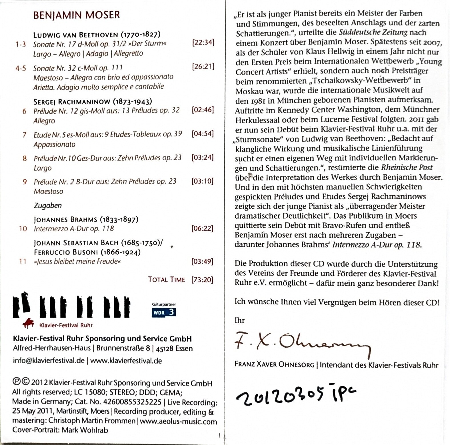 [중고] 루르(Ruhr) 피아노 페스티발 현장 녹음 음반 / Benjamin Moser