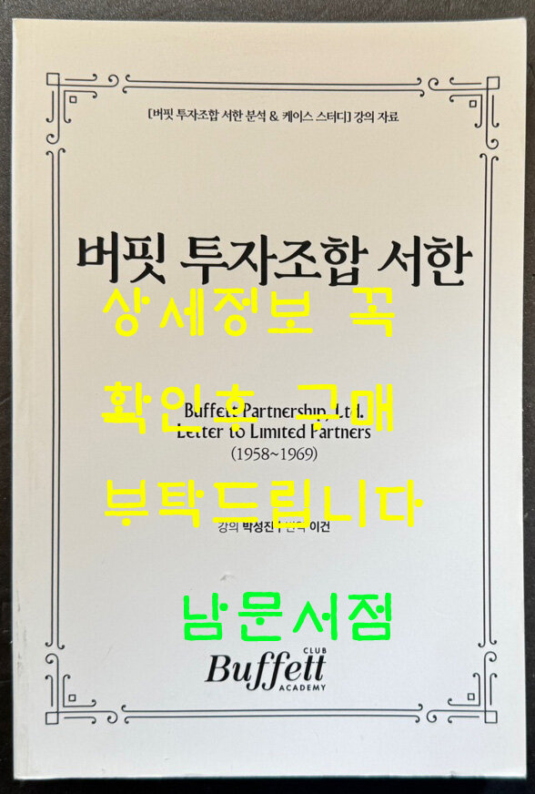 [중고] 버핏 투자조합 서한 1958-1969 / 버핏 투자조합 서한분석 & 케이스 스터디 강의자료 / 버핏클럽  / 251페이지 / 판권따로없음