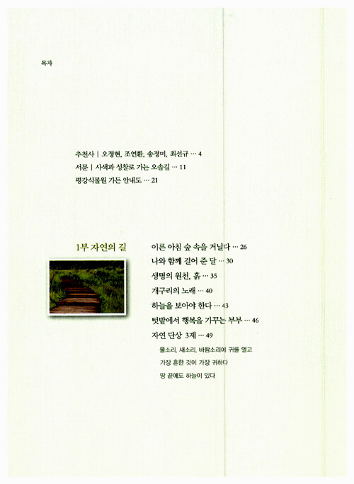『평강으로 가는 오솔길』은 ‘평강식물원’의 원장으로 인생의 후반전에 열정을 다하고 있는 한의사 이환용 원장의 책이다. 평강식물원에서 자연의 한없는 풍요로움을 느끼고 그것과 호흡하면서 우러나오는 소박한 생각들을 기록한 것이다. 도시에서 일상의 삶에 쫓겨 살 때는 보지 못했고 듣지 못했고 느끼지 못했던 것들을 체험하면서 이곳에 행복이 있고 기쁨이 있고 건강이 있다는 사실을 전하고 있다. 식물들과 대화하면서, 정성들여 심은 나무들이 커가는 모습을 보면서, 살갗을 타고 오는 바람을 맞으며, 산마루로 떨어지는 해를 보면서, 작은 오솔길을 걸으면서 인생의 사색과 성찰를 경험할 수 있다. 이 책은 자연 속에서 누린 행복과 감동을 나누고자 한다.