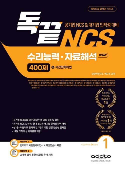 • 독끝 NCS 수리능력·자료해석 400제: 공기업 NCS & 대기업 인적성 & PSAT 대비 - 전2권 - 한국전력공사·한국철도공사·한국도로공사·한국가스공사·수자원공사·한국수력원자력·한전KPS·국민건강보험공단·근로복지공단·국민연금공단·인천국제공항공사·한국토지주택공사·중소벤처기업진흥공단·농어촌공사·한국조폐공사·한국관광공사·한국공항공사·강원랜드·코레일테크·한국남동발전·한국서부발