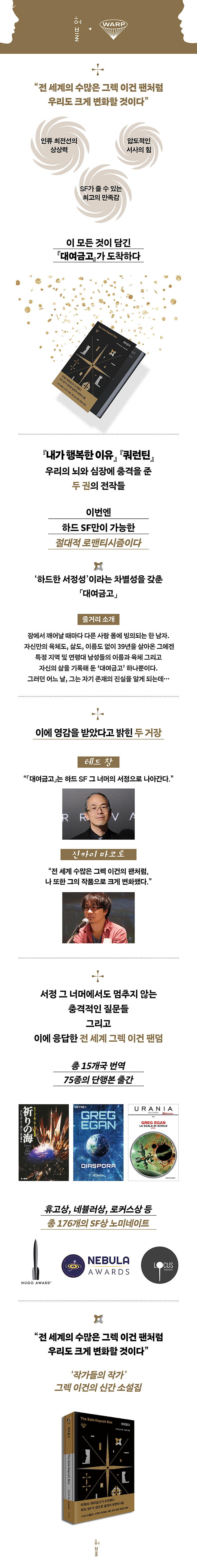 : “그렉 이건이 SF, 특히 과학적 엄밀함과 정합성을 중시하는 하드 SF의 일인자로 꼽힌다는 사실은 새삼 강조할 필요도 없겠지만, 그런 그가 ‘작가들의 작가’라는 찬사를 듣는 이유는 데뷔 이후 첨단 과학 연구의 성과를 때로는 통절하고, 때로는 냉혹하기까지 한 서사의 형태로 독자에게 전달하는 ‘전도자’로서의 역할을 성실하게 수행해 왔기 때문이다. 유전공학, 나노과학, 위상수학, 고전물리학, 양자역학 등 다양한 분야에 걸친 대표작을 편찬한 『대여금고』는 이런 경향을 가장 뚜렷하게 보여주는 쇼케이스다.”